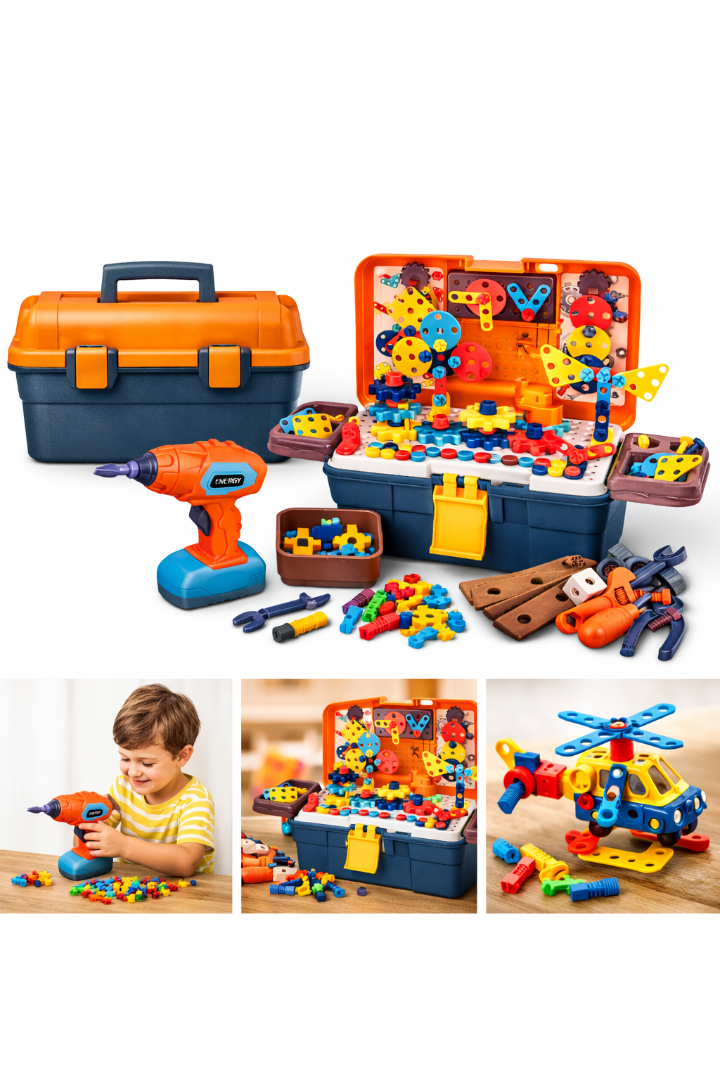 Deze complete 298-delige bouwset verandert eenvoudig van een handige gereedschapskoffer naar een interactieve werkbank. Perfect voor nieuwsgierige kinderen die graag met hun handen werken.